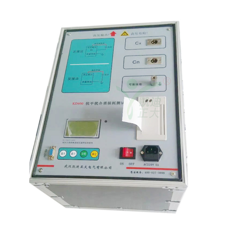 KD600B介質(zhì)損耗測試儀是發(fā)電廠、變電站等現(xiàn)場自動測量各種高壓電力設備介損正切值及電容量的高精度儀器。由于采用了變頻技術能保證在強電場干擾下準確測量。儀器采用中文菜單操作,微機自動完成測量。