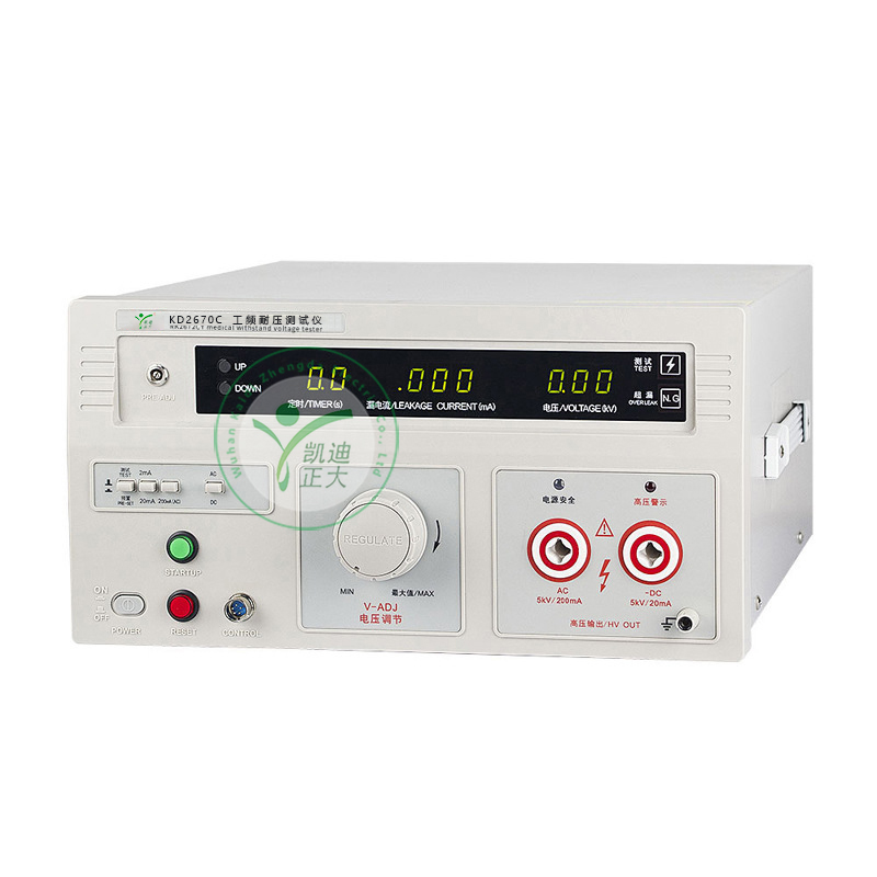 KD2670C工頻耐壓試儀是通用型的高壓測試儀器,廣泛用于電工器材、膠木電器、變壓器、電源線、電能表、電機、電源插頭座、電纜線等的耐壓測試,以及各種電子電氣產品的耐壓測試。
