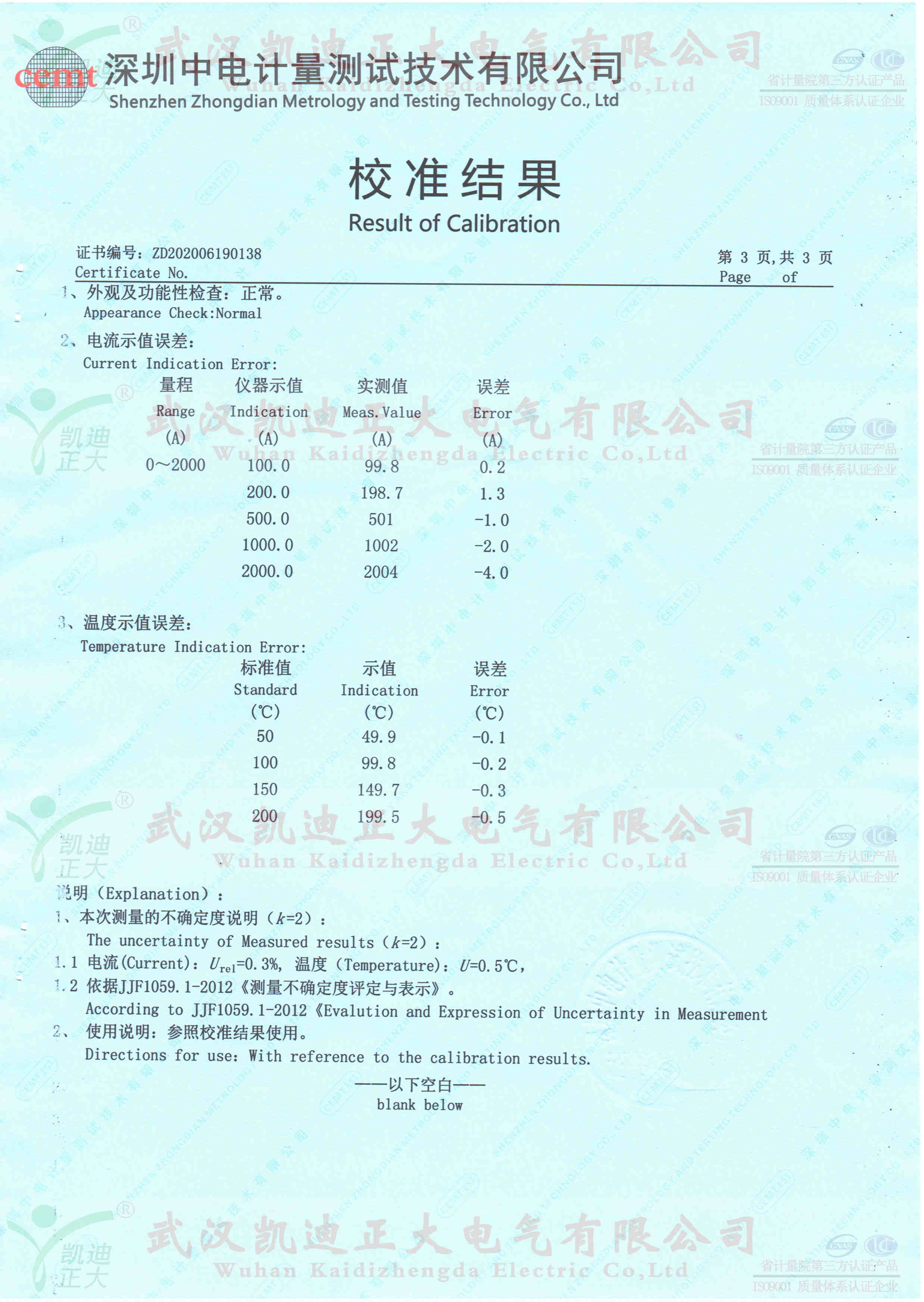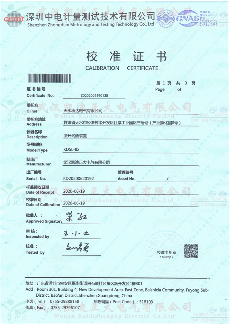 這次擔任我司檢測服務的是深圳中電計量測試技術公司,KDSL-82溫升試驗裝置2000A,證書編號:ZD202006190138,校準證書合格。
