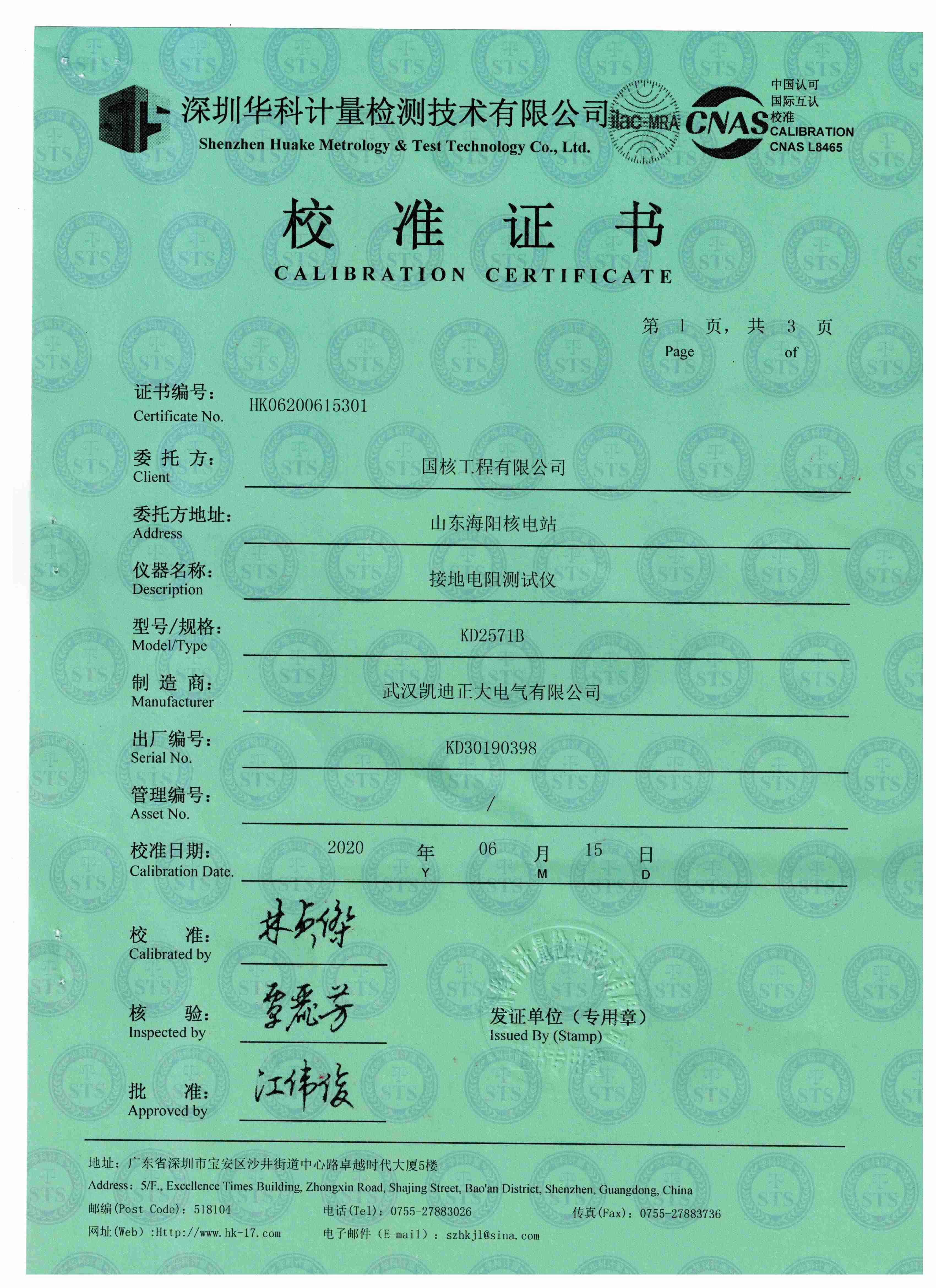 海陽(yáng)核電購(gòu)置KD2571B接地電阻測(cè)試儀獲得校準(zhǔn)證書