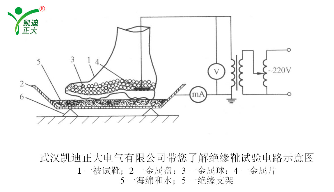 將一個(gè)與試樣鞋號(hào)一致的金屬片為內(nèi)電極放人鞋內(nèi),金屬片上鋪滿直徑不大于4mm的金屬球,其高度不小于15mm,外接導(dǎo)線焊一片直徑大于4mm的銅片,并埋入金屬球內(nèi)。外電極為置于金屬器內(nèi)的浸水海棉,試驗(yàn)電路見圖。