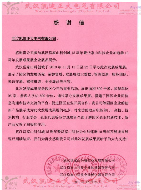 年關將至,凱迪正大公司收到一份來自岱家山科技企業加速器公司的感謝信,感謝我司的創新產品展示成為發展成果展的亮點。此次我司參展的創新產品有:KDHG-518B變頻互感器特性綜合測試儀、KDVLF-80kV超低頻交流耐壓試驗裝置、KDJB-1200微機繼電保護測試儀等設備。來訪的政府職能部門、高校、技術機構、行業協會、企業代表等參觀者共同見證了我們公司新產品的新技術。