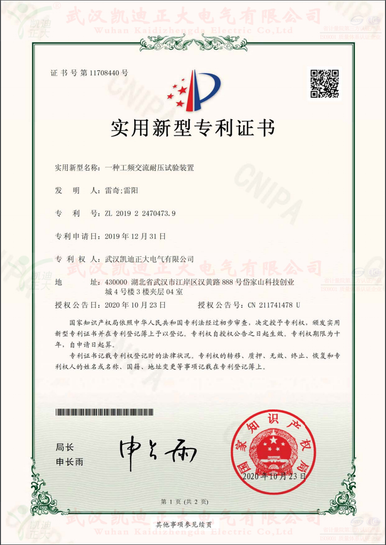 一種工頻交流耐壓試驗裝置。證書號第11708440號,專利號:ZL 2019 2 2470473.9,發明人:雷奇;雷陽,專利權人:武漢凱迪正大電氣有限公司,授權公告號:CN 211741478 U。
