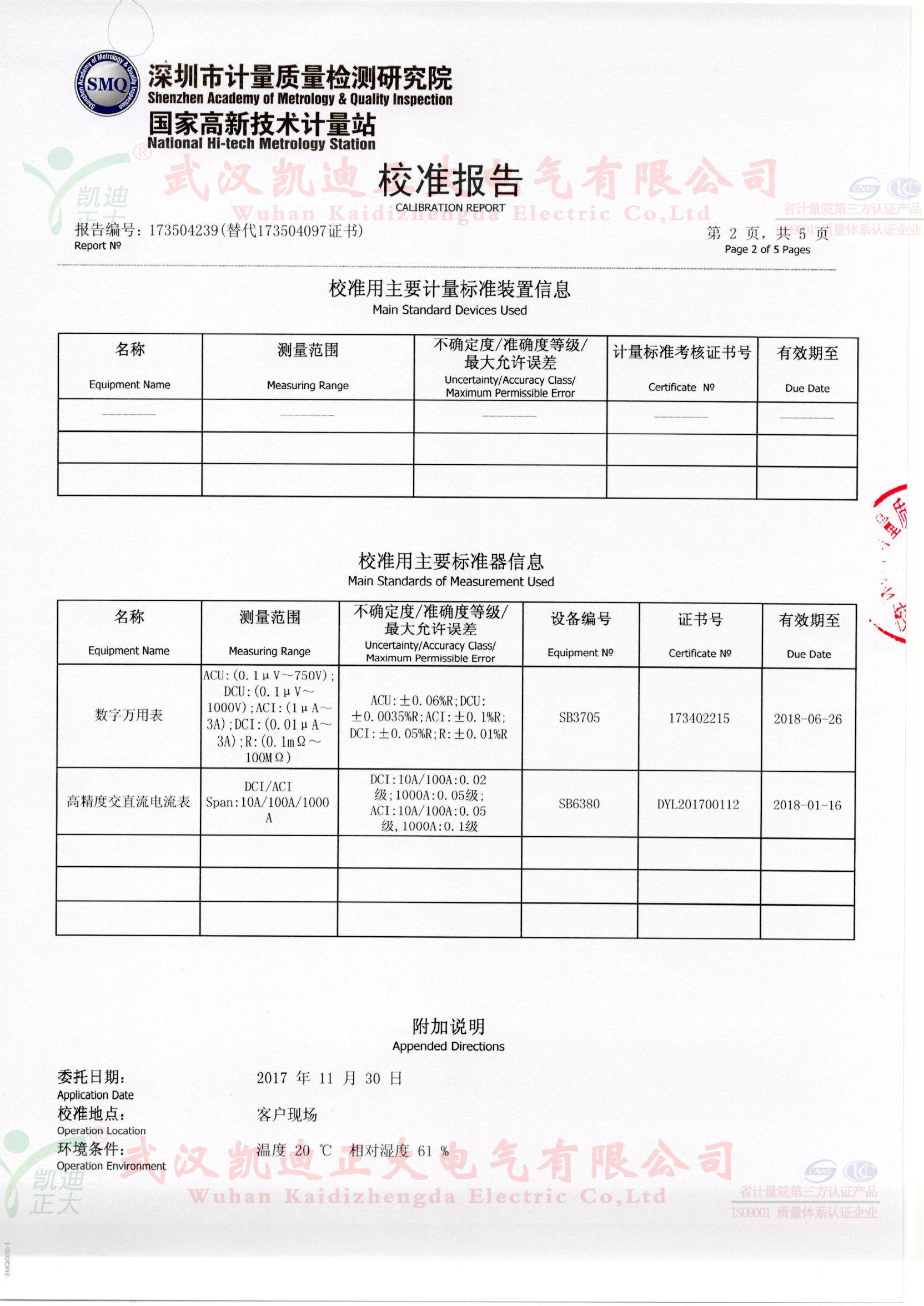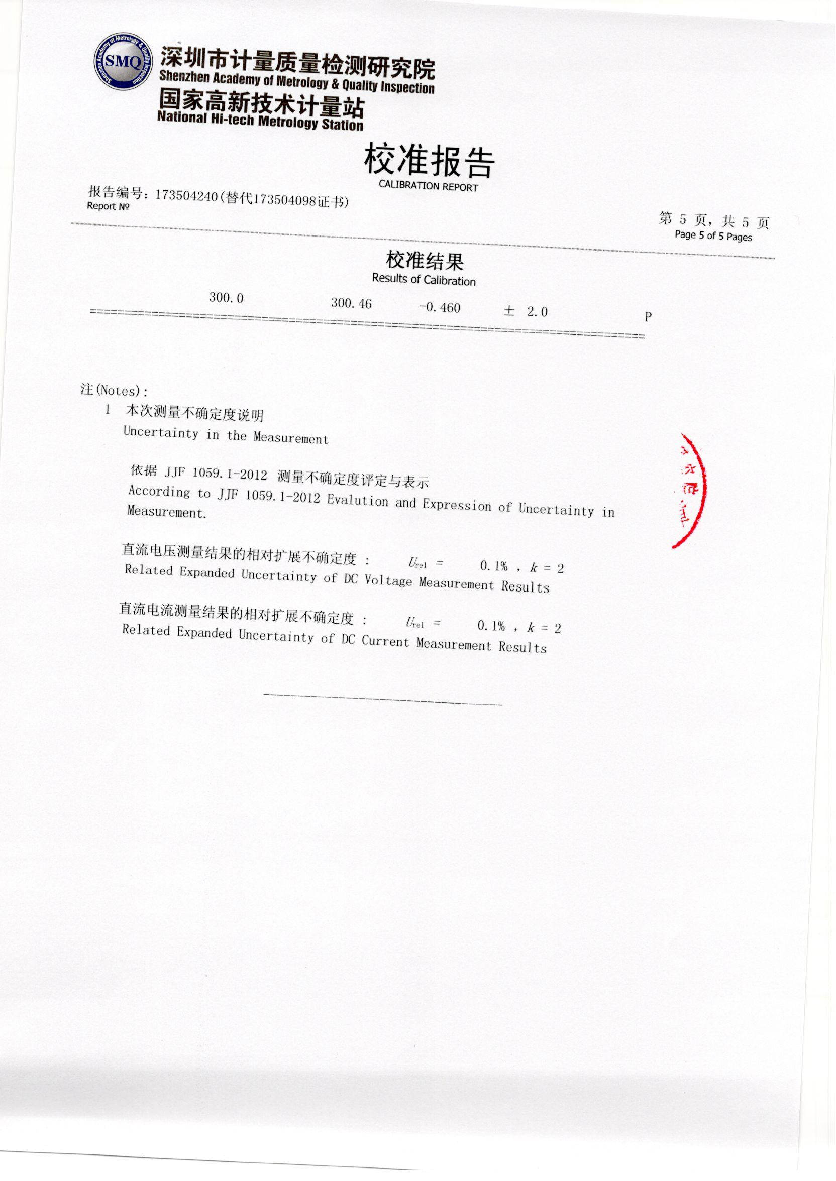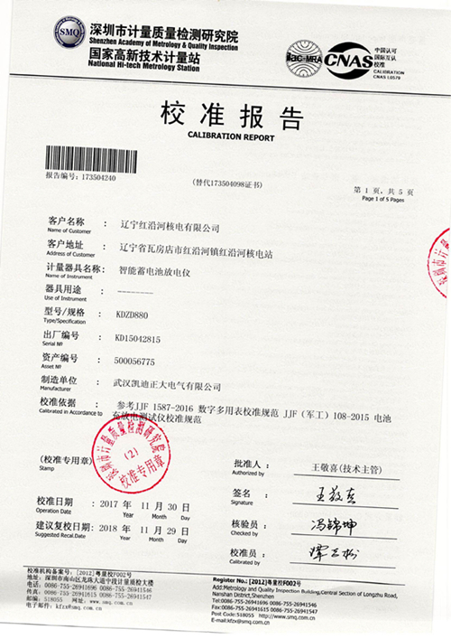 應(yīng)中廣核遼寧紅沿河核電有限公司的需求,將武漢凱迪正大電氣公司生產(chǎn)的KDZD880(110V300A)智能蓄電池放電儀出具國家高新技術(shù)研究院的計(jì)量報(bào)告后才能使用。校準(zhǔn)報(bào)告:173504098證書號(hào),出廠編號(hào):KD15042815,資產(chǎn)編號(hào):500056775,校準(zhǔn)依據(jù):參考JJF158-2016數(shù)字多用表校準(zhǔn)規(guī)范JJF(軍工)108-2015電池充放電測試儀校準(zhǔn)規(guī)范。嚴(yán)格出具檢定合格報(bào)告。