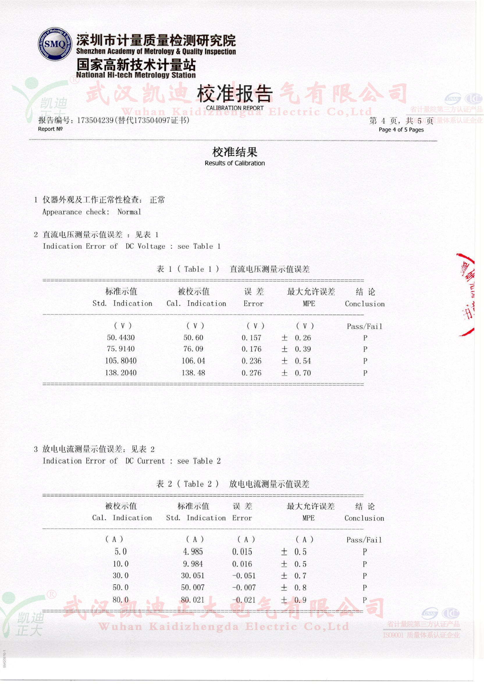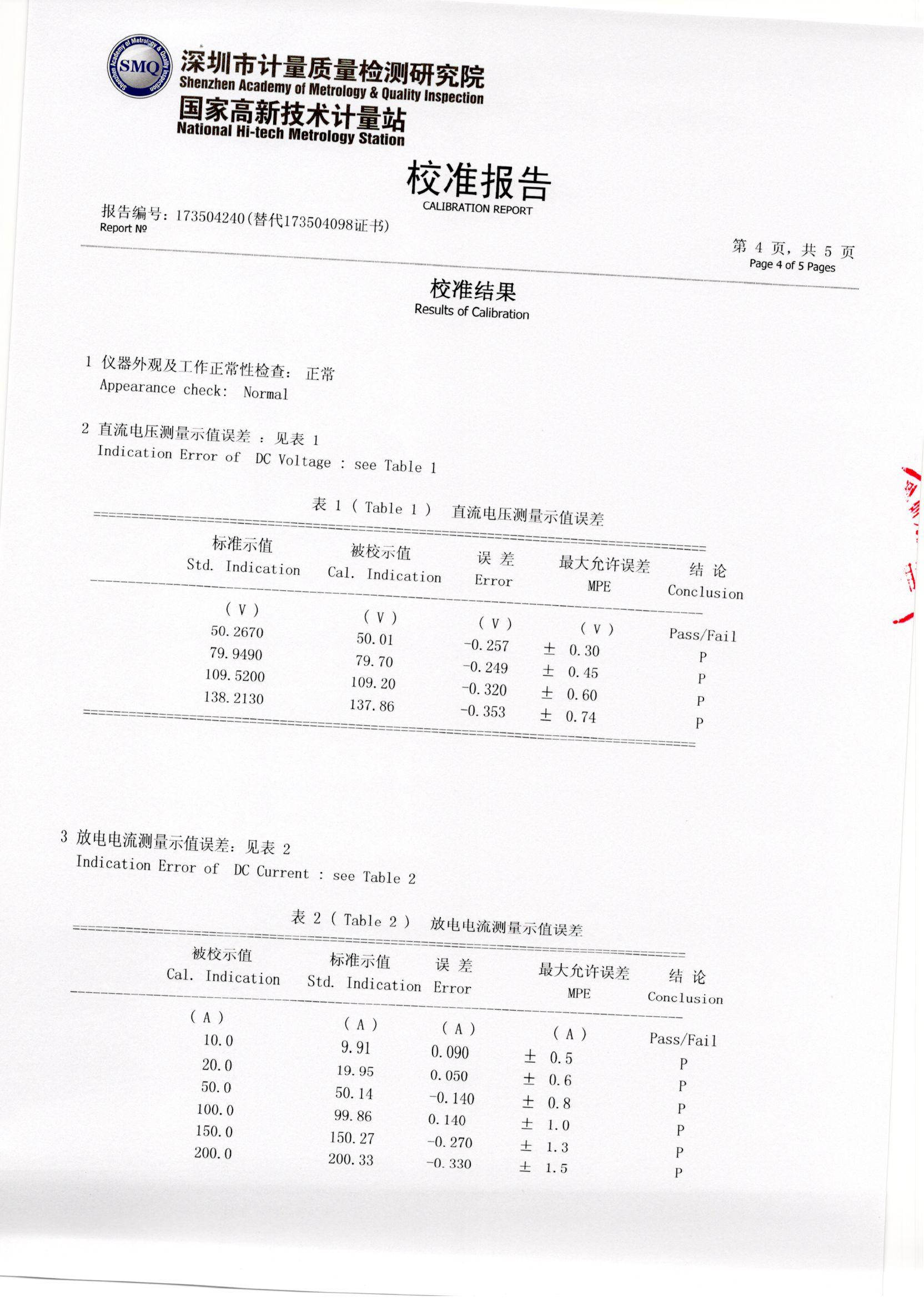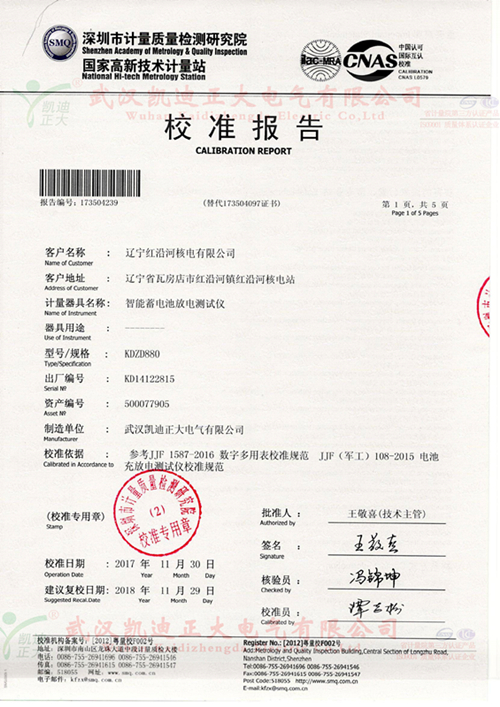應(yīng)中廣核遼寧紅沿河核電有限公司的需求,將武漢凱迪正大電氣公司生產(chǎn)的KDZD880(110V80A)智能蓄電池放電儀出具國家高新技術(shù)研究院的計(jì)量報(bào)告后才能使用。校準(zhǔn)報(bào)告:173504097證書號(hào),出廠編號(hào):KD14122815,資產(chǎn)編號(hào):500077905,校準(zhǔn)依據(jù):參考JJF158-2016數(shù)字多用表校準(zhǔn)規(guī)范JJF(軍工)108-2015電池充放電測試儀校準(zhǔn)規(guī)范。嚴(yán)格出具檢定合格報(bào)告。