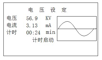 - 試驗電壓范圍為5KV至額定值。(請不要設(shè)小于5KV的試驗電壓),它規(guī)定了我們所要升至的試驗電壓。儀器升至接近這個設(shè)定電壓值時,就不再升壓,并保持在這個峰值下進(jìn)行等幅的正弦波輸出。