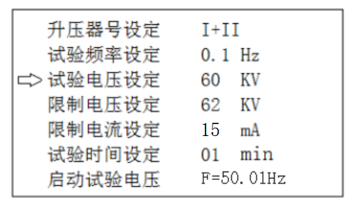 - 升壓器號設(shè)定:如果使用I號升壓器單獨升壓,升壓器號設(shè)定為I號(此時試驗電壓設(shè)定≤30KV),如果使用I號升壓器和II號升壓器串聯(lián)升壓,升壓器號設(shè)定為I+II號。