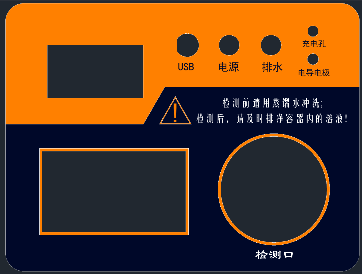 將排水管插入排水孔,按下“排水”按鍵即可將被測溶液從排水管排出,待被測溶液全部排出后,再加入適量蒸餾水,進行清洗,可反復(fù)沖洗幾遍,直到容器內(nèi)沖洗干凈并排盡所有蒸餾水后,恢復(fù)“排水”按鍵,拔出排水管。