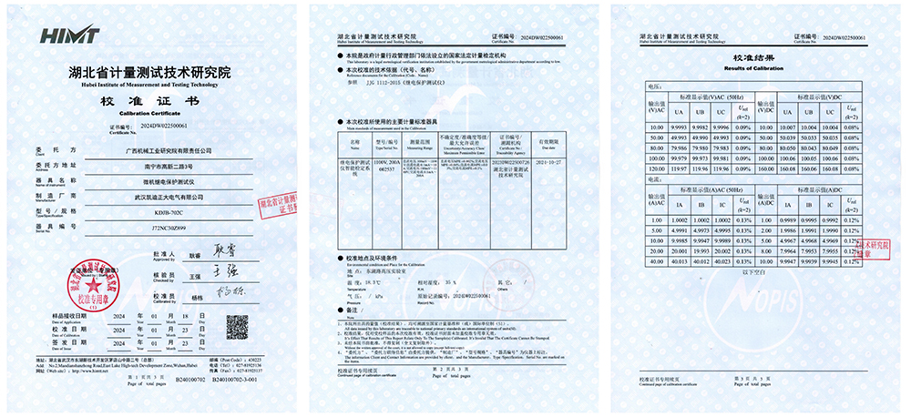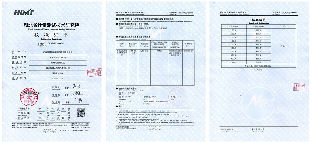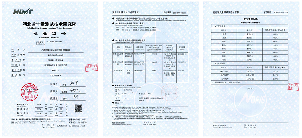 2024年1月22日,廣西機械工業研究院有限責任公司采購武漢凱迪正大的KDHG-A 互感器綜合測試儀 、KDHL-100A 回路電阻測試儀、KDJB-702C 微機繼電保護測試儀等電力儀器儀表,通過了湖北省計量測試技術研究院的嚴格校準。武漢凱迪正大作為電力儀器儀表的供應商,先后為國內外多家企業提供所需的的試驗設備,產品在行業內受到廣泛好評和推崇。