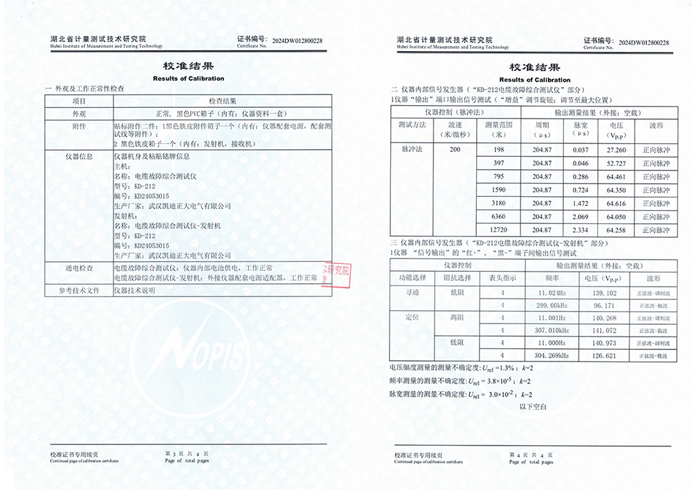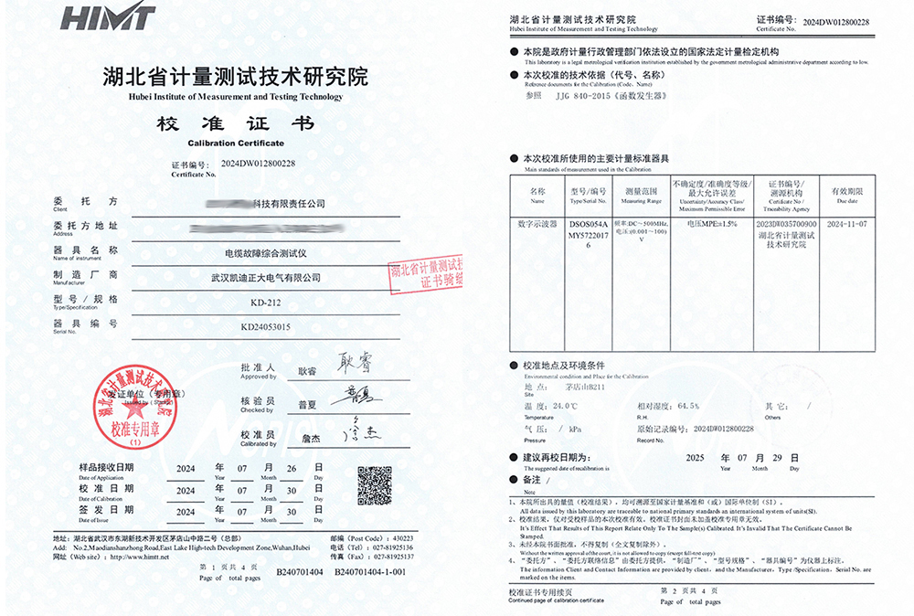 值得強(qiáng)調(diào)的是,KD-212電纜故障綜合測(cè)試儀不僅贏得了河北地震局認(rèn)可,還順利通過(guò)了湖北省計(jì)量測(cè)試技術(shù)研究院的嚴(yán)格檢測(cè),獲得了校準(zhǔn)證書,這再次證明了其技術(shù)水平和測(cè)量結(jié)果的準(zhǔn)確性。