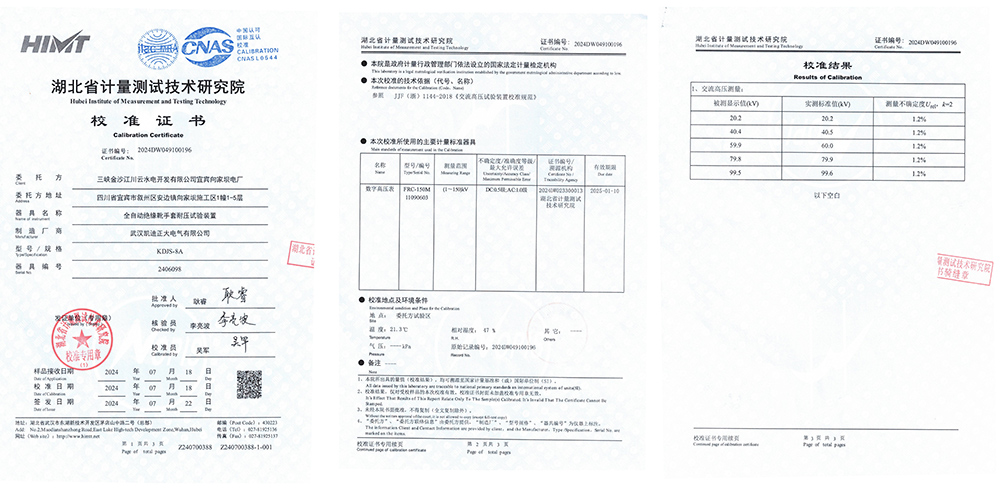 近日三峽金沙江川云水電開發有限公司宜賓向家壩電廠訂購的我司KDJS-8A全自動絕緣靴手套耐壓試驗裝置,設備順利通過了湖北省計量測試技術研究院的嚴格檢測。
