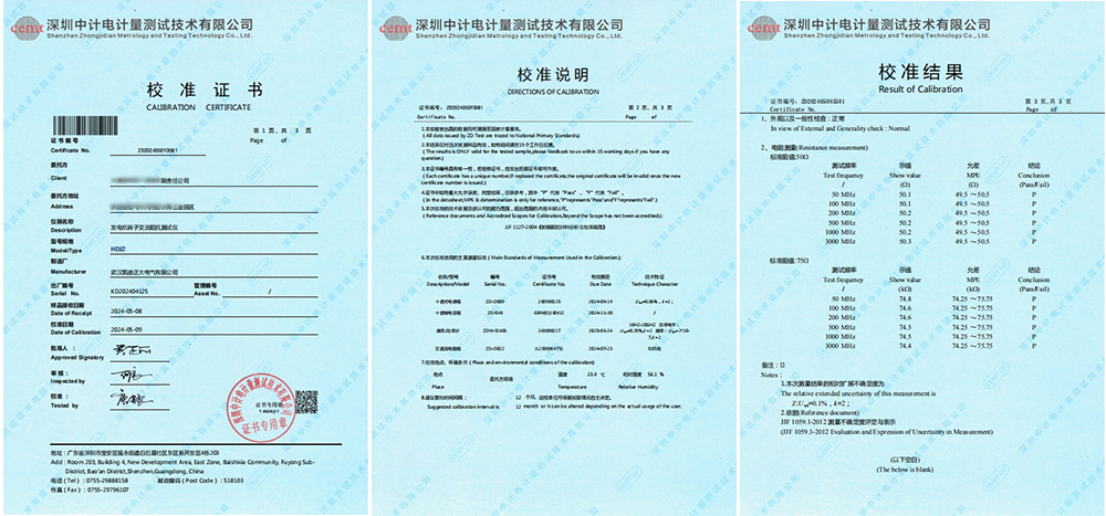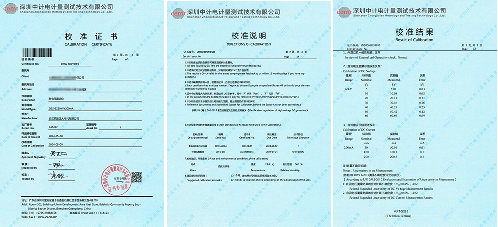近日,陜西省寶雞市某發電有限責任公司訂購的武漢凱迪正大電氣有限公司的發電機轉子交流阻抗測試儀與ZGS-SZ60kV/200mA水內冷發電機耐電壓測試儀,成功通過了深圳中計電計量測試技術有限公司的嚴格校準,并榮獲校準證書。
