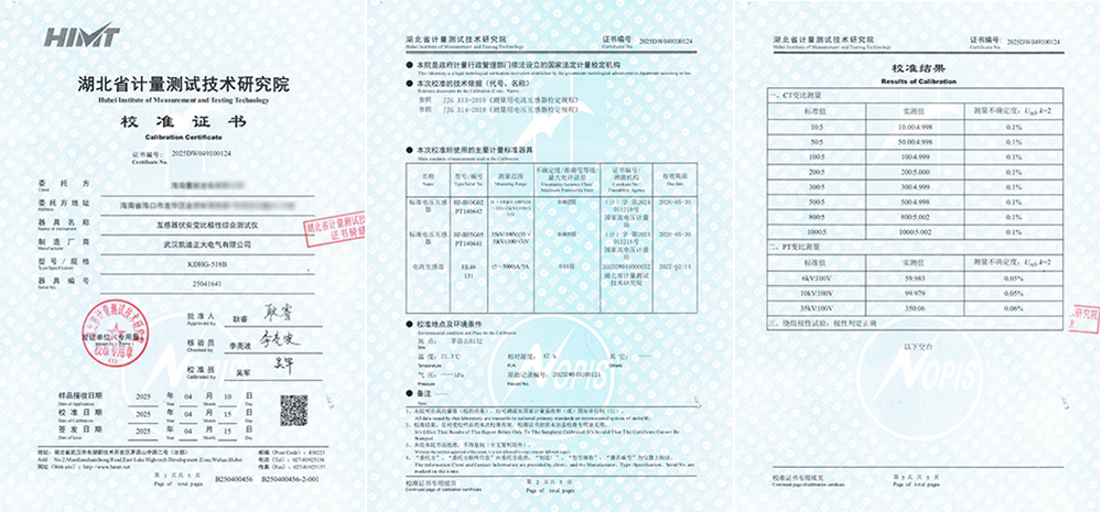近日,海南某發電有限公司采購武漢凱迪正大的兩套KDHG-518B互感器伏安變比極性綜合測試儀,均成功通過了湖北省計量測試技術研究院的嚴格校準,并順利取得校準證書。