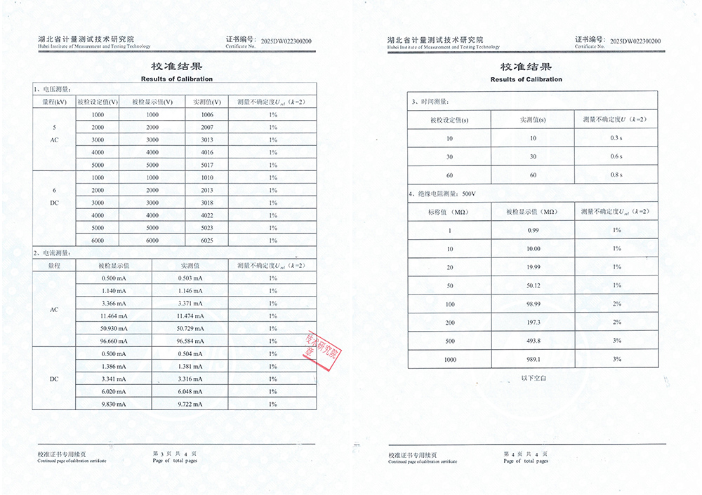 此次校準(zhǔn)過程對KD7742智能絕緣耐壓測試儀來說是一次嚴(yán)苛的考驗(yàn)。湖北省計(jì)量測試技術(shù)研究院作為計(jì)量校準(zhǔn)機(jī)構(gòu),以其專業(yè)的技術(shù)水平和嚴(yán)謹(jǐn)?shù)男?zhǔn)流程著稱。校準(zhǔn)過程中,研究院對KD7742的各項(xiàng)性能指標(biāo)進(jìn)行了全面、細(xì)致的測試和評估,包括其交/直流耐壓測試、絕緣電阻測試等功能模塊的準(zhǔn)確性和穩(wěn)定性。經(jīng)過一系列嚴(yán)格的測試,KD7742智能絕緣耐壓測試儀成功通過了校準(zhǔn),獲得了校準(zhǔn)證書。這不僅證明了KD7742智能絕緣耐壓測試儀在設(shè)計(jì)和制造上的品質(zhì),也體現(xiàn)了武漢凱迪正大電氣有限公司對產(chǎn)品質(zhì)量的嚴(yán)格把控和持續(xù)追求。
