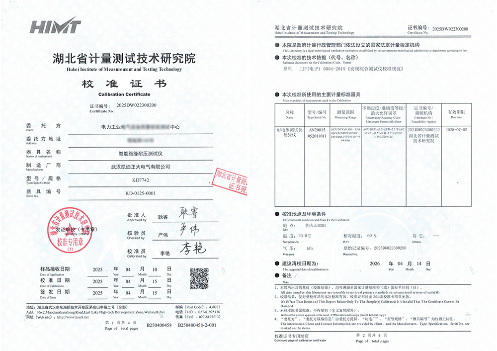 近日,電力工業(yè)某測試中心采購的武漢凱迪正大電氣有限公司的KD7742智能絕緣耐壓測試儀,成功通過了湖北省計(jì)量測試技術(shù)研究院的嚴(yán)格校準(zhǔn),并榮獲校準(zhǔn)證書。這標(biāo)志著KD7742智能絕緣耐壓測試儀在精確度和可靠性方面達(dá)到標(biāo)準(zhǔn),進(jìn)一步鞏固了其在電力測試領(lǐng)域的地位。