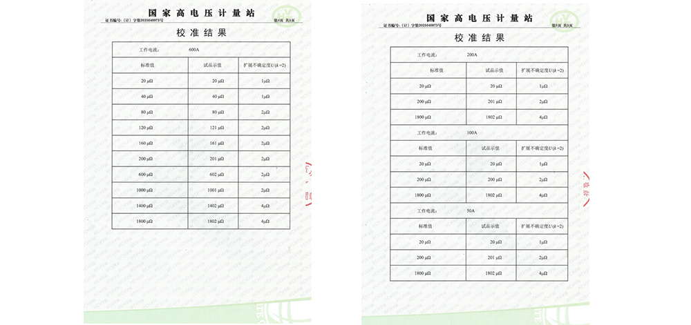 在校準過程中,國家高電壓計量站采用了最大充許誤差為±0.1%讀數的直流大功率標準電阻作為校準器具,校準環(huán)境為溫度21℃℃、濕度56%RH。校準內容包括對測試儀在600A、200A、100A、50A不同電流下的測量結果。經過一系列嚴格的測試和比對,KDHL-600A回路電阻測試儀成功通過了校準。