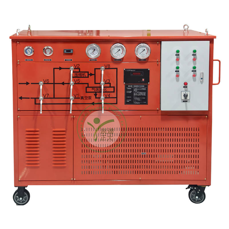 本裝置由SF6氣體回收凈化裝置組成。涉及的產品的主要優點為能直接將回收的SF6氣體以液態的形式貯存入容器,并能將GIS內的殘壓回收至53Kpa,擁有較小的體積,便于移動的放置,擁有較快的抽真空速度,能對回收的SF6氣體進行干燥和過濾,還能回充SF6氣體至SF6電氣設備。