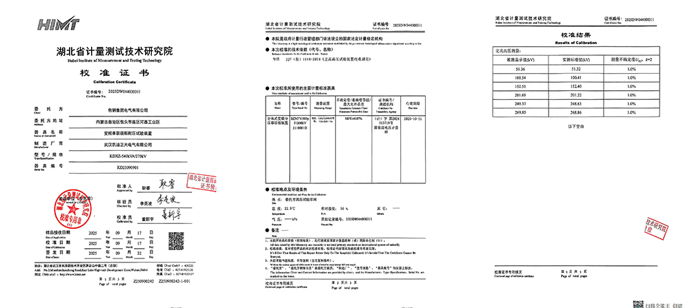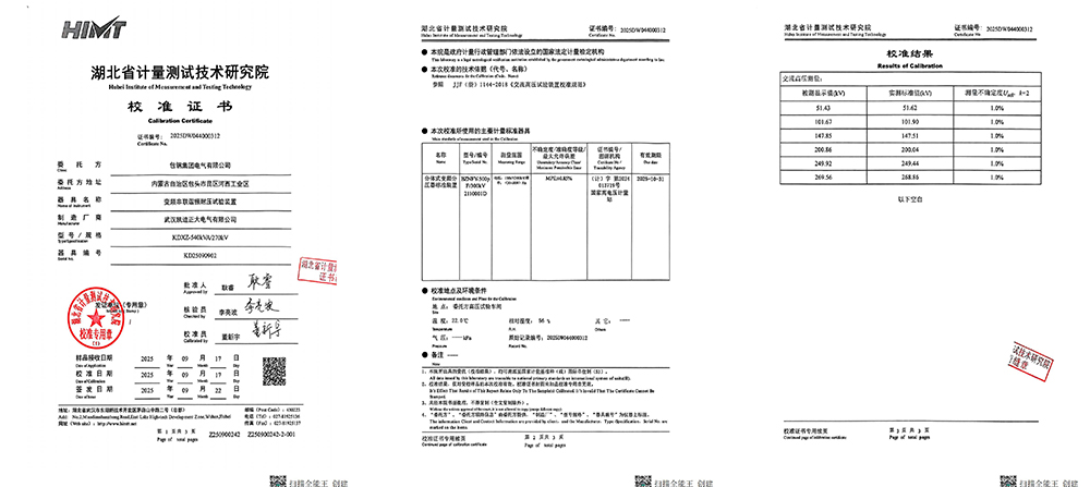 在電力設備制造與運維領域,高壓耐壓試驗是確保輸變電設備安全可靠運行的關鍵環節。變頻串聯諧振耐壓試驗裝置因其輸出波形純凈、效率高、對試品損傷小等優勢,已成為高壓試驗的常用設備。近期,包鋼集團電氣有限公司從武漢凱迪正大電氣有限公司采購了兩套型號為KDXZ-540kVA/270kV的變頻串聯諧振耐壓試驗裝置,湖北省計量測試技術研究院對其進行校準。2025年9月,兩套裝置均順利通過校準,獲得證書編號分別為2025DW044000312和2025DW044000311的校準證書。